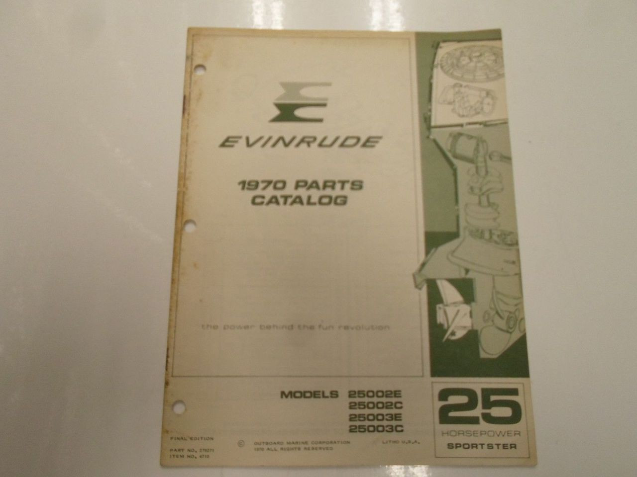 1970 EVINRUDE 25 HP SPORTSTER MODEL 25002E 2C 3E 3C PARTS CATALOG MANUAL STAINED Note: Parts catalog manual is stained on the front & back cover towards the spine. This is NOT A SERVICE MANUAL. Over all the contents within are in good legible condition. See Photos.