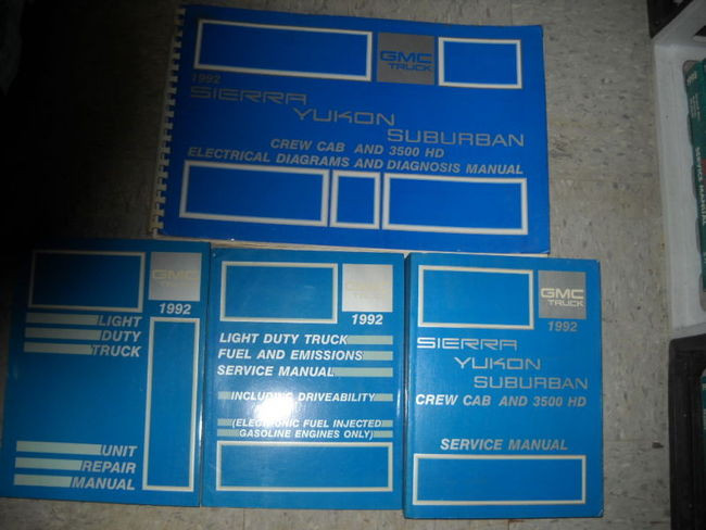 Used factory 1992 GMC Sierra/Yukon/Suburban/Crew Cab and 3500 HD service manual,unit repair manual,fuel and emissions service manual, and the electrical diagrams and diagnosis manual... What you see is what you will receive, we don't use stock photos... Tons of useful information and illustrations, covers alot...