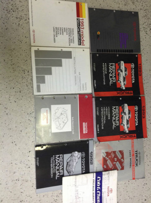 1993 Toyota Truck Factory Service Manual 2 Volume Set.Volume 1 includes engine/specifications. Volume 2 includes chasis/body/electrical/specifications, Electrical Wiring Diagrams Manual which has some water damage,Automatic Transaxle Manual, New Car Features Manual, Air Conditioner Installation Manual, Body Dimension Guide Manual, Cab & Chassis Book.