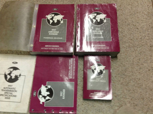 FACTORY 1997 Ford Ranger Body/Chassis Service Manual,Powertrain/Drivetrain Service Manual,Specifications Manual,Automatic Transmission Special Specifications Issue Manual, and the Electrical Wiring Diagrams Manual.
