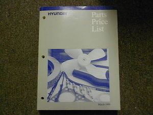 1999 HYUNDAI PARTS PRICE LIST MANUAL Full of parts information, covers parts information only, no missing pages,great manual to have when you own a HYUNDAI This manual is published by HYUNDAI, and are the same manuals the HYUNDAI Mechanics/Technicians use.