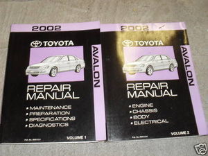 2002 Toyota Avalon factory service manual 2 volume set... volume 1 covers preparations/specifications/diagnostics/Maintenance, and volume 2 covers engine/chassis/body/electrical... Loads of information and illustrations, covers a lot, no missing pages, step by step instructions, assembly/disassembly, exploded illustrations/diagrams/troubleshooting, great manual to have when...