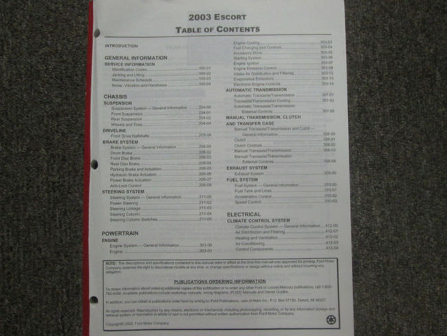 2003 FORD ESCORT SERVICE MANUAL... NOTE:... Manual is missing the front cover... Loads of information and illustrations, covers a lot, step by step Instructions, exploded illustrations and/or diagrams, great manual to have when you own Ford Escort. This manual will save you money in Repairs/Service... This manual is...