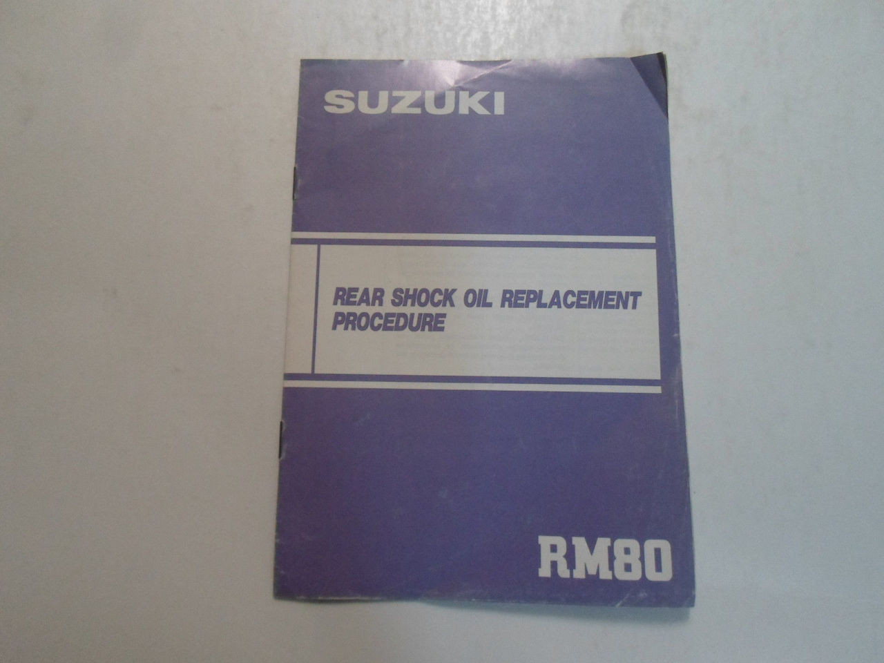 SUZUKI RM80 REAR SHOCK OIL REPLACEMENT PROCEDURE MANUAL WORN Note: Manual has wear on the front and back cover, over all the manual is in good legible condition. This manual only has two pages of information. See Photos. Informative illustrations, covers VERY LIMITED INFORMATION, This manual is published by SUZUKI , and are the same manuals the SUZUKI Mechanics/Technicians use. If you have further questions feel free to message us or call us at 248-313-9658